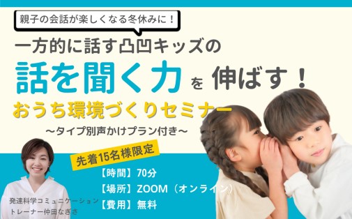 この度、『親子の会話が楽しく なる冬休みに!一方的に話す凸凹キッズの話を聞く力が伸びるおうち環境づくりセミナー』 の申し込みを開始しました。