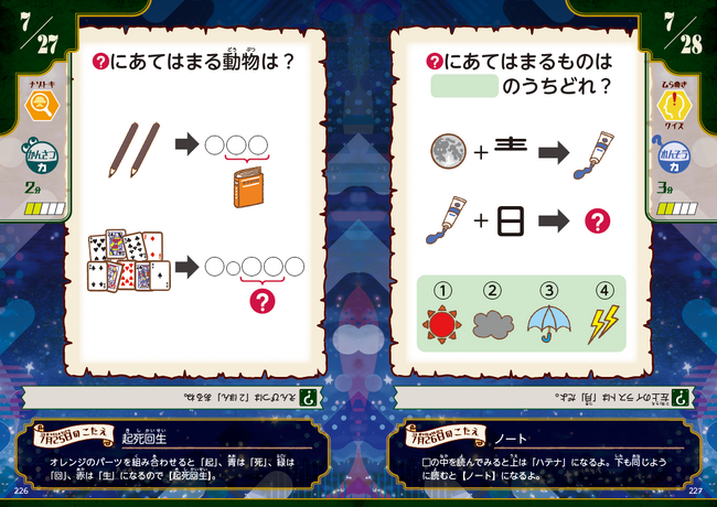 クイズは「ひらめきパズル」「暗号解読」「ナゾトキ」「なぞなぞ」「思い出しクイズ」「あるなしクイズ」「ひっかけクイズ」「ひらめきクイズ」「連想クイズ」の9種類。さまざまな角度から頭脳を磨きます。
