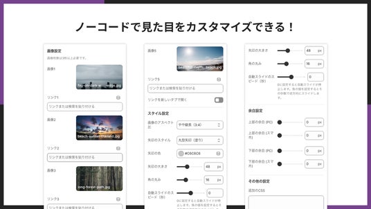 画像比率、矢印の表示・デザイン、角丸、余白、オートスライドの有無などを、テーマエディタ上の設定だけで調整できます。