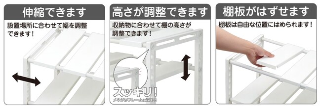 1.幅と棚の高さが調整でき、収納する物に合わせて調整可能です。伸縮幅は46~74cm。棚の高さは約3cmピッチで調節していただけます。
