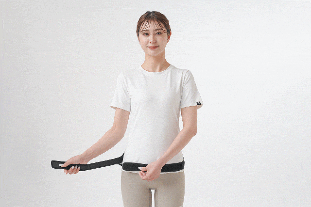 腰に本体ベルトを巻いて、左右のストラップをスーッと引っ張ってとめるだけの簡単操作!