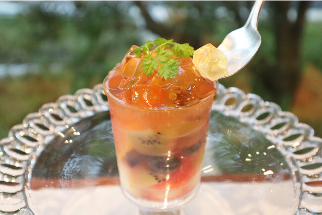 レモンゼリーの中にフルーツがごろっと入っているゼリー。