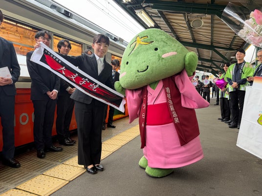 同車は、1919年の箱根登山鉄道開業当初より改造を重ねながら100年以上現役で走り続けてきた、日本最古の定期運行電車(当社調べ)として2028年1月に引退予定です。本年度の入社式は、小田急箱根グループの経営理念である「箱根に関わるすべての「ひと」を大切に「心躍る時間」を創造し、未来へつないでいきます」を体現し、「これまで受け継がれてきたおもてなしの精神を、次の世代へつなぐ」という想いを込めてサプライズで実施しました。昭和の趣きを残す歴史的な100形の車内で入社式を行い、新入社員たちは緊張した様子もありながら、車窓に流れる春の箱根を感じ、新たな社会人としての決意を胸に刻みました。箱根湯本駅では駅係員から温かく見送られ、強羅駅では箱根強羅観光協会のマスコットキャラクター「ごうらん」や協会の方々から記念品贈呈などの歓迎をいただくなど、新世代の未来への門出の祝福を受けました。