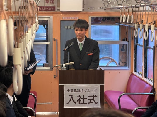 小田急箱根グループの株式会社小田急箱根(本社:神奈川県小田原市 社長:水上 秀博)、箱根登山バス株式会社(本社:神奈川県小田原市 社長:野村 尚廣)は、2026年4月1日(水)、箱根登山電車100形車両(モハ1形・モハ2形)での入社式を初開催し、7名の新入社員を迎えました。