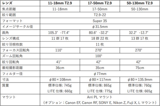 11-18mm、17-50mm、50-130mmの3本でシリーズを構成し、現代の映像制作者の多様なニーズに応えられるよう設計されています。