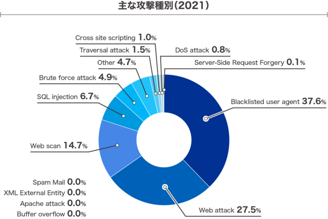 今回の調査期間における主な攻撃種別の攻撃状況を見ると、前述の通り全体の総数は増加しているものの、主だった傾向は2020年のそれと、さほど大きくは変わっていない状況です。最も多かったのは、脆弱性スキャンツールなどを利用したBotによる攻撃である「Blacklisted user agent」で、全体のおよそ37.6%を占め、次にWebサーバを構成するソフトウェアの脆弱性に対する攻撃である「Web attack」が約27.5%と続いています。そして3番目に多かったのは、攻撃の対象を探索・調査、また無作為に行われる単純な攻撃で脆弱性を探すなどの「攻撃の予兆」である「Web scan」ですが、全体の約11.1% → 14.8%、件数が37,192,991件 → 61,438,071件と、2020年より少なからず増加していました。また、7番目に多かった、WEBサーバ上のファイルに不正アクセスする「Traversal attack」については、2020年の9番手から件数が