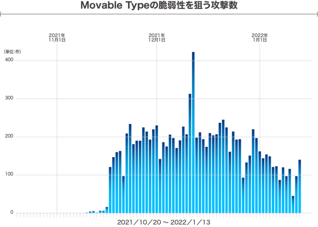 本脆弱性につきましては、実際に当社では2021年11月10日より、同攻撃と想定される通信を検知しております。また、同年11月後半から年末年始にかけて、多数のsidからの攻撃と想定される通信を検知しています。もし脆弱なままのMovable Typeを外部からアクセス可能な状態で稼働し続けていると、今後様々な被害を受ける可能性がございますので、最新のバージョンにアップデートし脆弱性への対策を行うとともに、すでに攻撃の影響を受けている可能性について調査をするなどの対応を推奨し、改めて注意を喚起します。