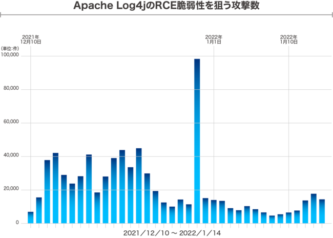 2021年2021年12月9日に、代表的なJavaのログ出力ライブラリである「Apache Log4j」に、リモートから悪用可能な脆弱性(CVE-2021-44228)の存在が公表されました。システムでは「ログ=履歴・記録」を記録する事は極めて重要なため、log4jはJavaを利用しているシステムで広く世の中で利用されています。今回公表された脆弱性の脅威度を表す指標(CVSS 3.0)の値は最高値「10.0」で、これほど容易に、かつ広範囲に影響するリスクは、数年に一度見るかどうかの極めて危険な脆弱性と言えます。当社においても、12月13日より現在に至るまで、攻撃と推定される通信を継続的に検知しています。