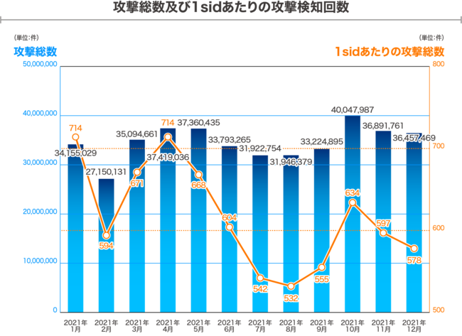 さらにsid(Security Identifier:ネットワークのユーザーアカウントやグループなどを一意に識別するセキュリティ識別子)は、年間676,198を数えました。2020年と比較して、2021年は攻撃検知総数もsid総数も増加しています。結果として1sidあたりの攻撃検知回数だけを見れば、およそ18,688回/月と減少しているようにも見えますが、現実は2020年よりも多くの攻撃者による通信が検知されたことになります。