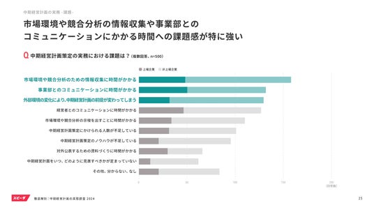 一方で、中期経営計画の策定には課題も多く、特に「事業部/経営者とのコミュニケーションに時間がかかる」「市場環境や競合分析のための情報収集に時間がかかる」といった業務負荷の大きさは深刻です。