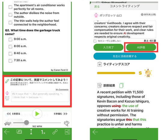 ライティングボックスに、読んだ記事に関するコメントを入力します。その後、右の「AI評価」ボタンを押すと、あなたのコメントの内容や文法に関するAIの詳細なフィードバックが閲覧できます。