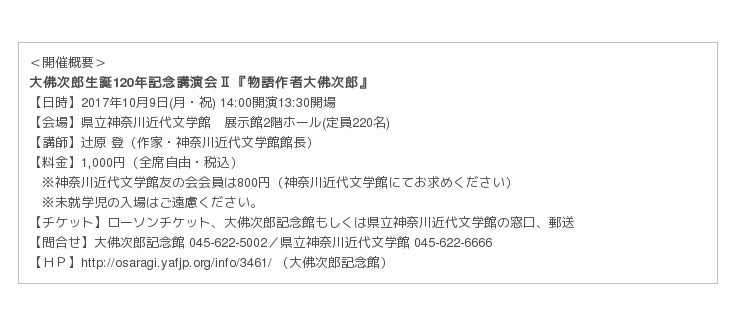 2017年10月9日(月・祝)、大佛次郎記念館(横浜市中区山手町113)は県立神奈川近代文学館(横浜市中区山手町110)との共催で「大佛次郎生誕120年記念講演会II『物語作者大佛次郎』」を開催します。