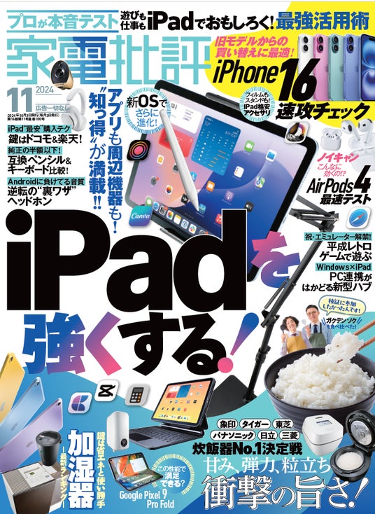 家電批評11月号は遊びも仕事もおもしろくするiPad最強活用術を総力特集! アプリや周辺機器など、iPadユーザーなら"知っ得"な情報をたっぷりとお届けします。他にも、最高に旨い米を食べたい人にチェックしてほしい「高級炊飯器ランキング2024」や、冬の乾燥に負けずにうるおす「最新加湿器格付け」など、生活が豊かになる家電情報も満載。本リリースでは、商品テストに基づくベストバイ製品の一部をご紹介します。