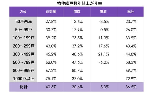 関西では200戸以上、首都圏では300戸以上の規模のマンションは平均値上がり率が40%を上回るなど、各エリア共に総戸数が多くなるほど値上がり率が高まる傾向にあります。