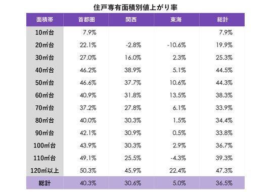 上の表は住戸専有面積別の値上がり率を示した表です。