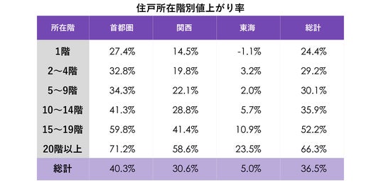 上の表は住戸の所在階別に値上がり率を示した表です。各エリア共に所在階が上になるにつれて値上がり率が上昇しています。また対象がタワーマンションに限定される20階以上は19階以下と比べて値上がり率が10ポイント以上高くなっています。