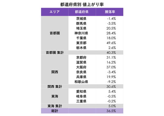 値上がり率が最も高いのは東京都の49.6%で新築分譲当時の約1.5倍の価格に上昇していることがわかります。以下は大阪府の37%、京都府の31%と続きます。各エリア共に都市部の値上がり率が高く、郊外エリアは低い傾向にあります。