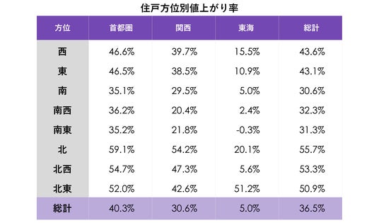 上の表は住戸の主開口部の方位別に値上がり率を示した表です。