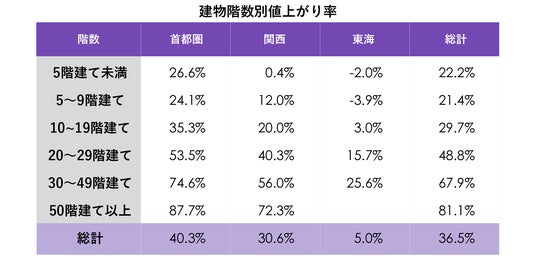 各エリア共に10~19階建てと、20階建て以上(タワーマンション)の間で大きく値上がり率が上昇しています。また50階建て以上のマンション(東海での中古流通はなし)の値上がり率は首都圏で87.7%、関西で72.3%と他の階数と比べても特に高く、建物階数が高いマンションほど値上がり率が高まる傾向にあると言えます。