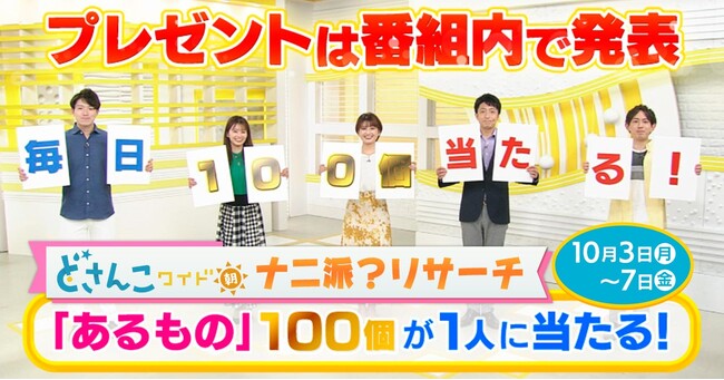 10月3日(月)~7日(金)の「ナニ派」では、「生活応援100個プレゼント」と題して、抽選で参加者1名様に、日々の生活にあるとうれしい『あるもの』を毎日100個プレゼントいたします。賞品は毎日変わり、何が当たるかは番組内で発表します。