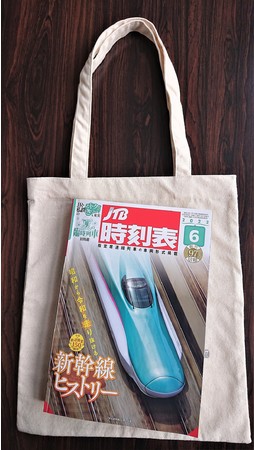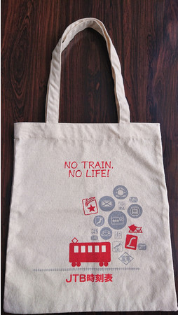 創刊97年の「JTB時刻表」で使用されている時刻表のマークをデザイン化しました。現在では運行していない新幹線の0系や夜行列車、寝台列車などのマークをあしらった完全オリジナルのかわいいエコバックです。サイズはB5判の「JTB時刻表」もすっぽり入る大きさで、裏面には文庫本サイズのポケット付き。100%コットンの丈夫で手になじみやすいトートバックです(W280mm×H320mm(持ち手含まない)、540mm(持ち手長さ))。販売価格は583円(税込)。売上の一部は、特定非営利活動法人OWSに寄付されます。