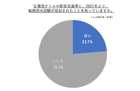 「電気ケトルの新安全基準※1に、2021年より転倒流水試験(転倒した際のお湯の流出量が50mL以下であること)が追加された」ことを知っている人は23.7%のみ。