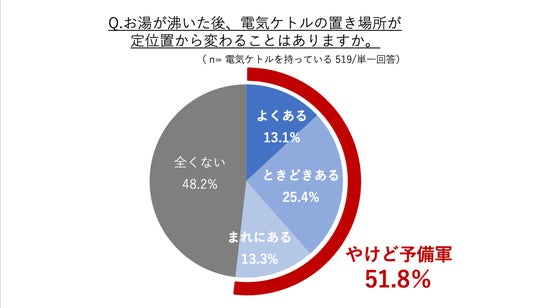 ・以上を踏まえ、お湯が沸いた後「電気ケトルの置き場所が定位置から変わる」ことがある人を調査した結果、なんと51.8%が該当する結果に。半数以上が”やけど予備軍”であることが判明しました。
