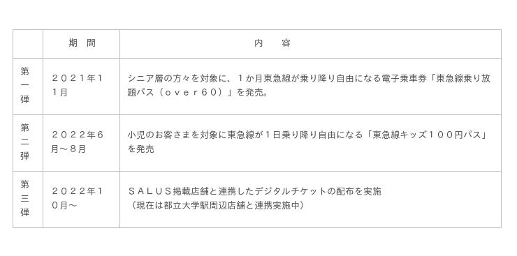 東急電鉄は、ライフスタイルの変化に対応し、時代にあった社会的価値を持続的に提供することを目指し、域内移動需要の創出を目的とした新たな乗車券サービスとして、2021年以降、シニア層を対象とした全線乗り放題デジタルチケット「東急線乗り放題パス(over60)」、小児のお客さまが100円で東急線1日乗り降り自由になる「東急線キッズ100円パス」、東急線沿線情報誌「SALUS」と連携したデジタルチケットの配布を実施しています。