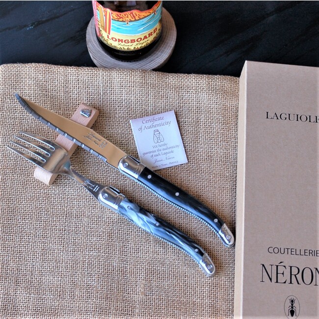 販売サイト amazon.jp ライヨール ABS ハンドル ステーキナイフ フォークセット 黒大理石風 ギフト箱入り フランス製 NERON 価格;¥10,780(税込)