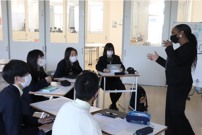 生徒のサポートには、併設校の追手門学院大学国際学部の教員5人も加わり、英訳のポイントやプレゼンテーションの仕方などについてアドバイスを行います。