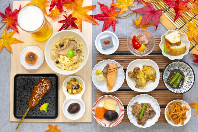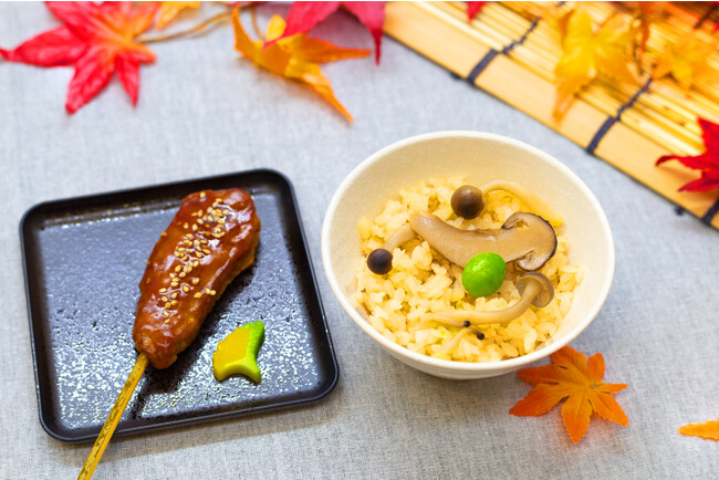 召し上がりやすいよう串焼きにした鶏つくねは、甘辛く照り焼き風に焼き上げ、白胡麻で風味を付けました。秋らしい、銀杏の葉をかたどったお麩を添えて。