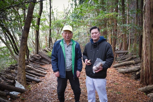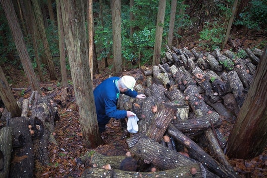 急峻な山の斜面に組まれたホダ木から椎茸を収穫