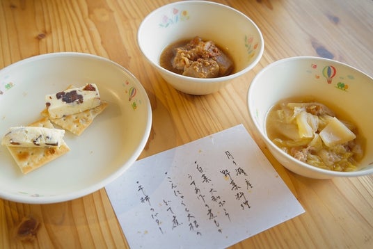 月ヶ瀬小学校の給食室の器に盛った中山氏による『月ヶ瀬産野菜料理』白菜・大和ポーク・うすあげの煮物