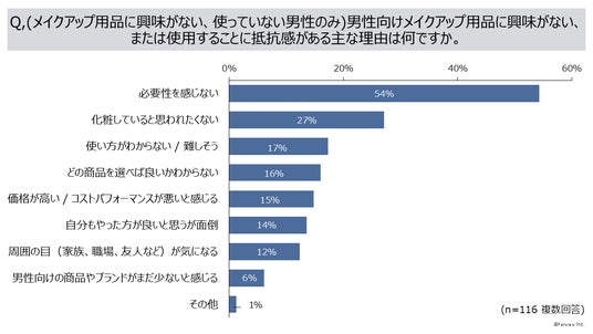 2.(「メイクアップ用品に興味がない、または現在使っていない」と回答した男性のみ)メイクアップ用品に興味がない、または現在使っていない理由は「必要性を感じない」54%、「化粧していると思われたくない」27%