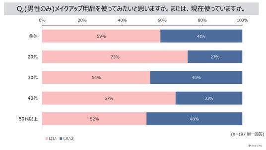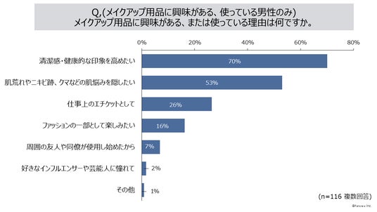 「メイクアップ用品を使ってみたいと思う、または現在使っている」男性は59%、理由は「清潔感・健康的な印象を高めたい」70%