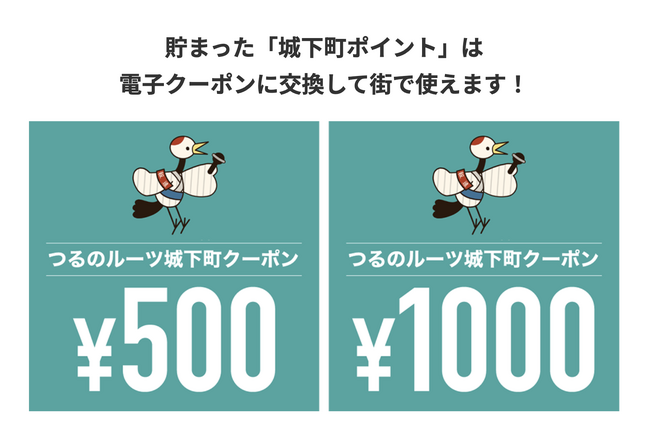城下町ポイントは、1ポイント1円相当で、都留の街で使える電子クーポンに交換し利用することができます。