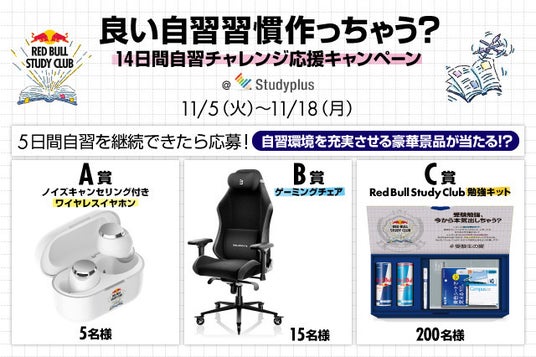 今回のイベントでは、学習管理アプリ「Studyplus」で「レッドブル 受験応援」の公式アカウントをフォローして、イベント期間中に5日以上連続で勉強記録を付けた高校3年生・浪人生の中から、抽選で220名様にノイズキャンセリング付きワイヤレスイヤホンをはじめとした自習に役立つグッズをプレゼントします。秋が深まり受験シーズンが近づいてきた中で、ラストスパートする大学受験生の頑張りを、「Studyplus」と「レッドブル」は全力で応援します。