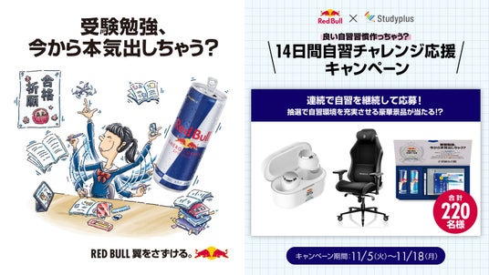 スタディプラス株式会社(本社:東京都千代田区、代表取締役:廣瀬高志、以下スタディプラス)は、レッドブル・ジャパン株式会社(本社:東京都港区、以下レッドブル)のレッドブル・エナジードリンクとのコラボキャンペーン企画「14日間自習チャレンジ応援キャンペーン」を、学習管理アプリ「Studyplus」上で大学受験生(高校3年生・浪人生)を対象に2024年11月5日(火)から11月18日(日)までの期間限定で実施します。