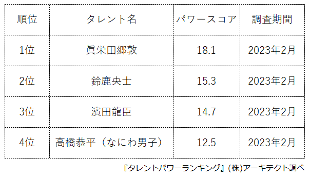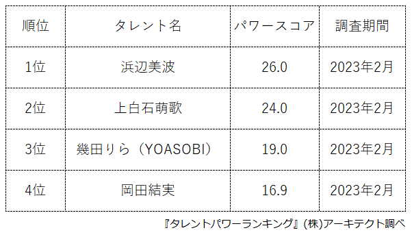 本ランキングは、2023年2月度に実施したタレント調査データ(一部過去実施データ)を利用し、タイトルに応じてランキング形式でまとめたものです。