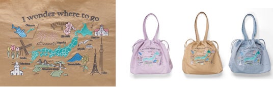 ドローストリングバッグは、日本列島のイラストマップに10エリアの観光スポットの魅力を繊細な刺繍で表現しています。眺めていると思わず旅に出たくなるデザインです。色はラベンダー、ベージュ、ブルーの3色展開。ドローストリングバッグを含む総額約¥11,000(税込)相当の地図柄アイテムが入っています。