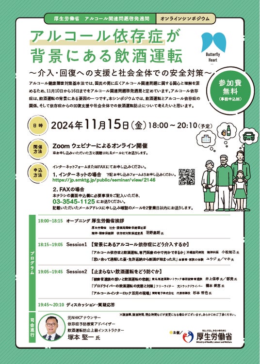 アルコール・インターロックの社会実装(違反者対策)のためのあらゆる活動と、アルコール問題を抱えた家族や親族を持つひとが、加害者家族にならない(被害者を生まない)ための予防活動を行う東海電子株式会社(本社:静岡県富士市 代表取締役 杉本 哲也)は、11月15日(金)に開催される厚生労働省主催のアルコール関連問題啓発週間オンラインシンポジウム「アルコール依存症が背景にある飲酒運転~介入・回復への支援と社会全体での安全対策~」に登壇いたします。