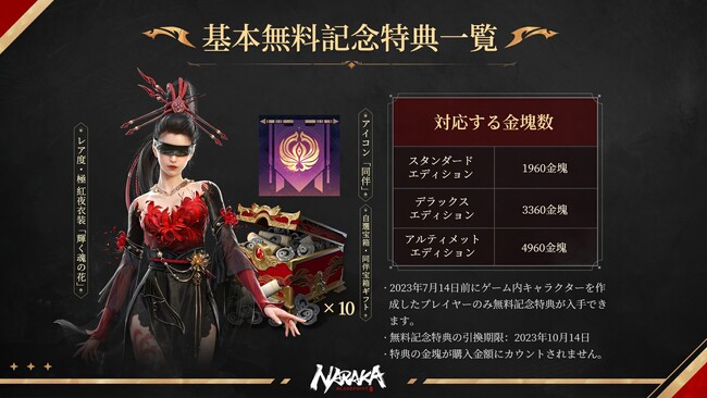 同時にPCとXbox Series X|S、Xbox Game Passのプラットフォームが無料となり、3つのアドバンストパッケージを購入してさらに多くの特典を得ることもできます。さらにベテランプレイヤー向けの特典として、過去に本作を購入したプレイヤーには、 購入価格と同等のゲーム内金塊及び他の記念特典をプレゼントいたします。