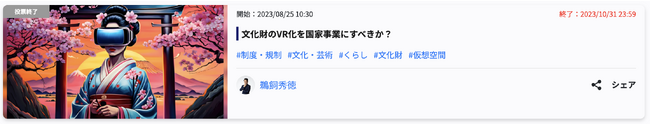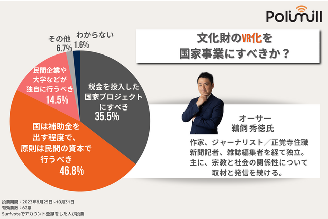 SNSとテクノロジーで社会課題の発見・解決をサポートするPolimill株式会社(ポリミル、本社:東京都港区、代表取締役:横田えり、以下Polimill社)はこのたび、「文化財のVR化を国家事業にすべきか?」というイシュー(課題)について10月31日に投票が終了しましたので結果をお知らせします。