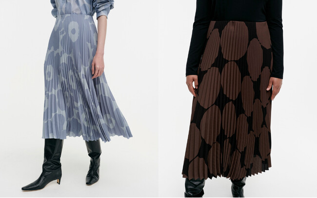 コレクションに登場するのは、ウニッコ(Unikko/ケシの花)やキヴェット(Kivet/石)などのアイコニックなプリントがデザインされたブラウスやプリーツスカート、キヴィナケーウンタ(Kivi nakee unta/夢見る石)が大胆にプリントされたワンピースなど全13型のアイテム。