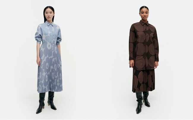 ウニッコ(Unikko/ケシの花)やキヴェット(Kivet/石)などのアイコニックなプリントはトーンオントーンでアイテムにデザインされ、調和のとれた色彩のスタイリングや洗練されたプリントの組み合わせを提案する。