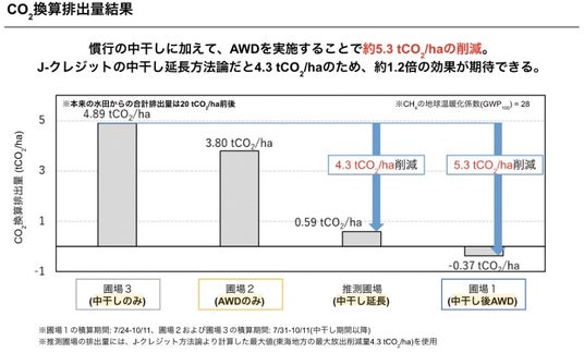 加えて、本実証条件に基づく比較では、AWD前および中干し前の排出量を含めない排出量を用いた結果、J-クレジットの中干し延長方法論における東海地方の最大削減係数(4.3tCO2/ha)(※2)と比較して、約1.2倍のメタン削減効果が期待できる可能性が示され、今後の追加実証および方法論化に向けた有用な知見が得られました。
