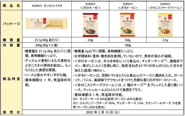 江崎グリコ株式会社は、おいしさと適正糖質*1を両立するブランド「SUNAO(スナオ)」から、糖質を21.1gに調整した「SUNAO もっちりパスタ」と、糖質を5g以下に調整した「SUNAO <ボロネーゼ><ポモドーロ><きのこ入りチーズクリーム>」のソース3種を江崎グリコ公式通販サイト「グリコダイレクトショップ」にて、2月7日(月)より予約受注を開始します。また、「SUNAO」アイスシリーズから「SUNAO マルチパック<バニラ>」を3月7日(月)より全国の各流通店舗などにて発売し、より習慣的に適正糖質の食生活を実践いただけるようラインアップを拡充します。