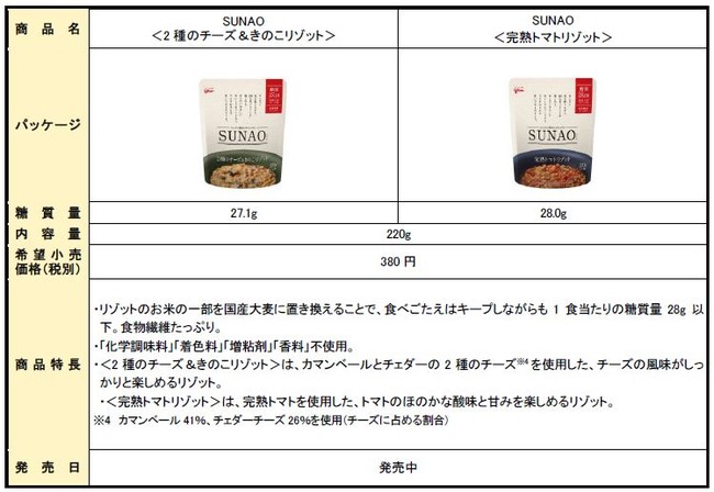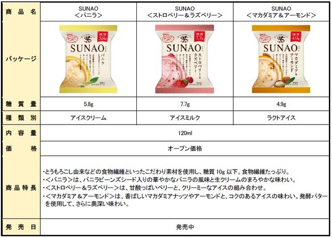 「SUNAO」は、お客様がからだに気を配りながら、100%食べることを楽しむために生まれたブランドです。「おいしさ」と「適正糖質」を両立する商品として2017年にアイス、2018年にビスケット、2020年にはリゾットをそれぞれ発売し、お客様に大変ご好評をいただいております。