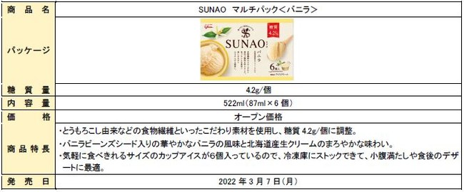 また、より習慣的に適正糖質の食生活をサポートするため、「SUNAO」アイスシリーズから「SUNAO マルチパック<バニラ>」も、3月7日(月)より全国の各流通店舗にて新発売します。