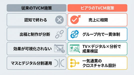 認知からユーザー獲得、ファン化までフルファネルでダイレクトマーケティングを行う株式会社ピアラ(本社:東京都渋谷区、代表:飛鳥貴雄、以下「当社」)は、TVCMに「誰に・どれだけ・どう届き、その後どう動いたか」までを担保する成果連動型TVCM支援サービスの提供を開始しました。デジタル広告で培った成果保証モデルをTVCMへ拡張し、インプレッション数を保証し、視聴後の行動データまで可視化することで、TVCMを「出す広告」から「当てる広告」へ変革します。